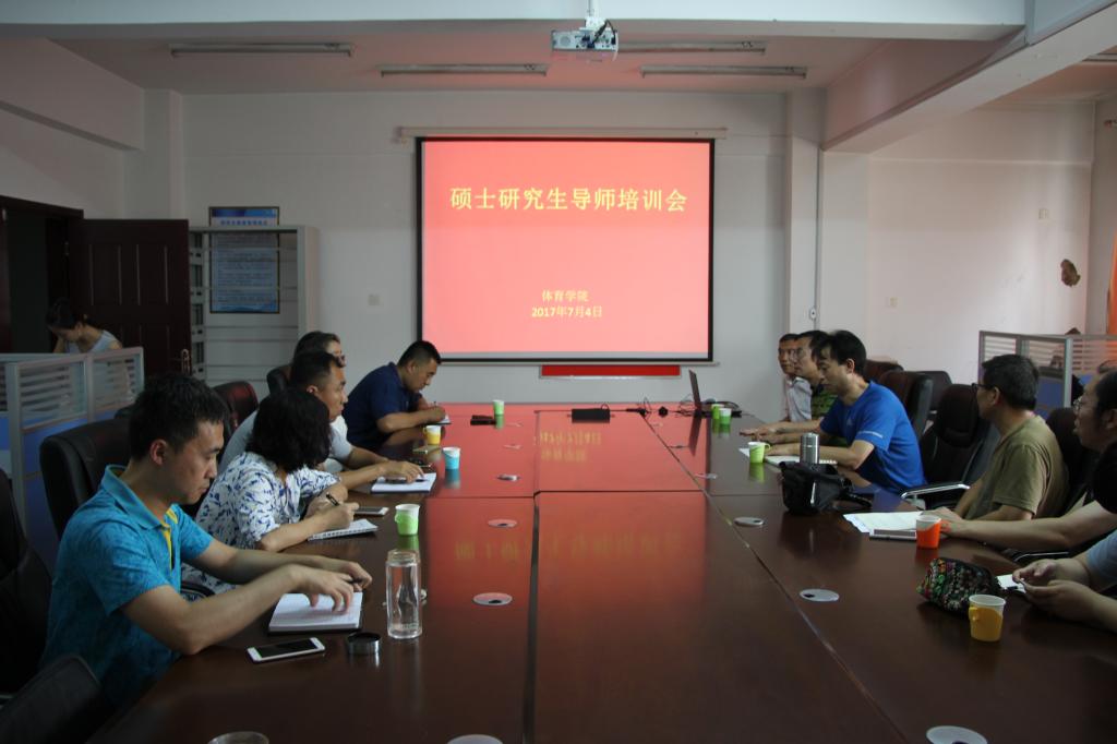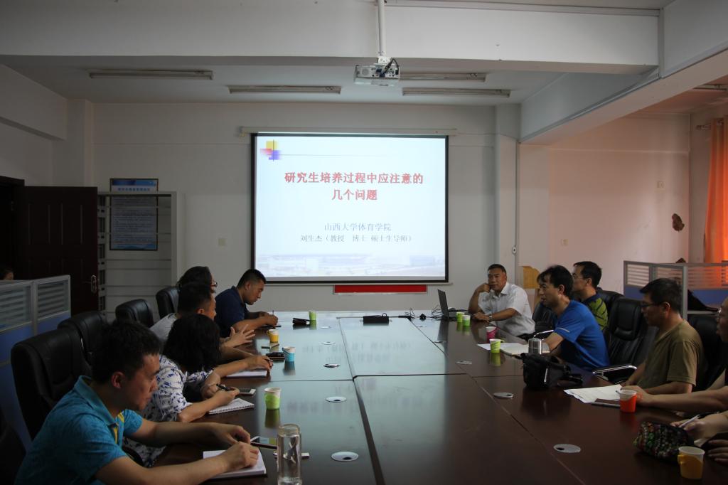 2017年7月4日下午,体育学院研究生导师培训会在学院研究生教室举行。会议由院长曹电康教授主持,并邀请山西大学裴雁曦教授、刘生杰教授作报告,另外,体育学院王晓刚副院长及10多名硕士生导师参加会议。