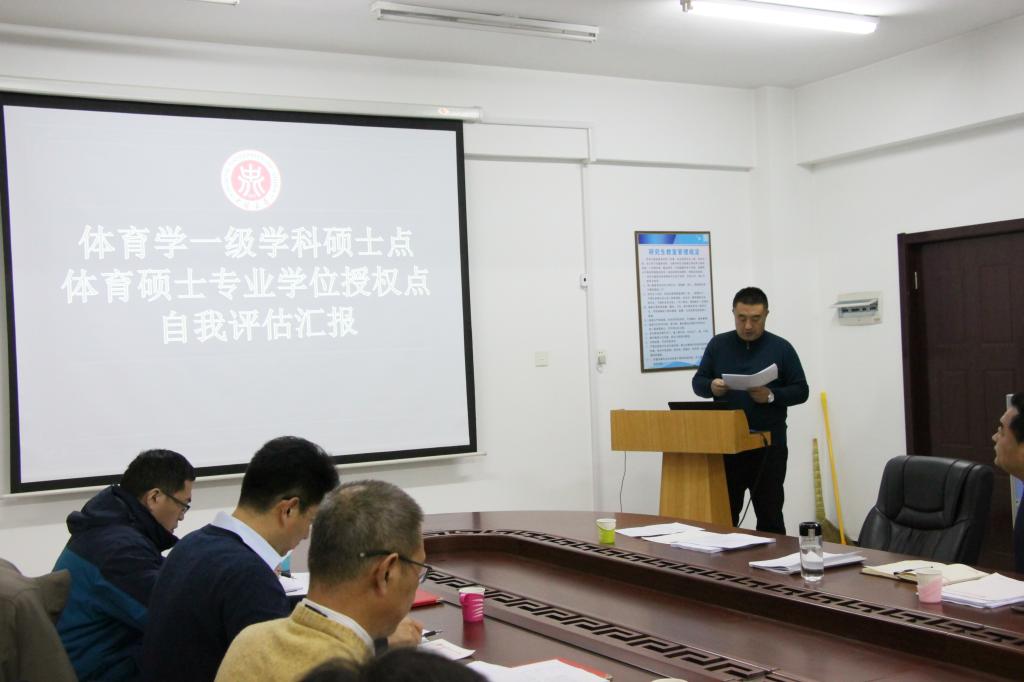 自我评估环节由我院科研副院长王晓刚分别就我院体育学、体育专业学位的学科发展情况依据评估体系向评估专家组汇报,并就评估工作流程与材料填报等具体问题向专家请教。各专家就我院的自评情况现场提问,互动交流,并根据我院的实际情况就具体的实施细则提供了指导性意见。