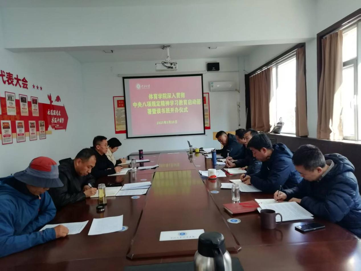 2025 年 3 月 28 日,体育学院在学院会议室317召开深入贯彻中央八项规定精神学习教育动员部署会暨专题读书班开班式。学院领导班子成员、党委委员、党支部书记、科级干部以及辅导员齐聚一堂,共同开启学习教育的新征程。