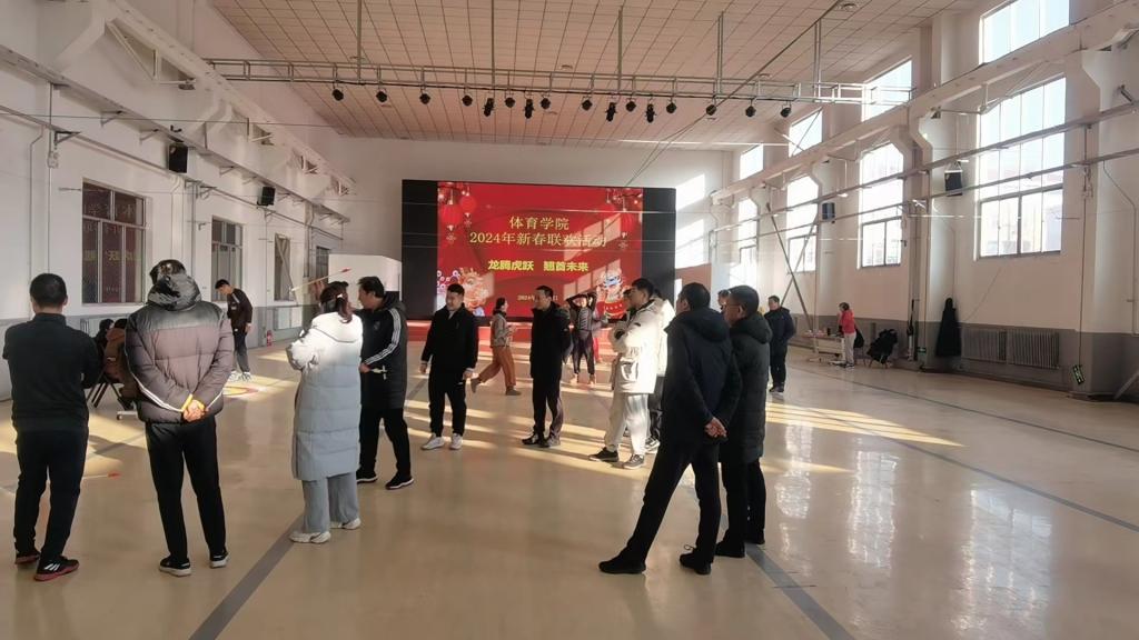 2024年新年伊始,为营造热烈的节日氛围,增进老师们之间的沟通和交流,进一步增强团队协作精神,营造温馨和谐充满凝聚力的体育学院大家庭氛围,使老师们以良好的精神状态、满腔的热情投入到新一年的教育教学工作中,1月10日下午3点,体育学院院领导及全体教师在学校东区训练馆开展“龙腾虎跃、翘首未来”为主题的教职工新年活动。