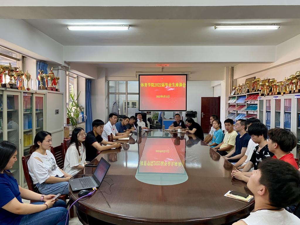 2022年6月15日下午,体育学院2022届毕业生座谈会在院楼二层会议室举行。体育学院党委副书记贾鹏、副院长吴剑、各科室负责人、全体辅导员以及全体在校毕业生参加了座谈。本次座谈会由院党委副书记贾鹏主持。