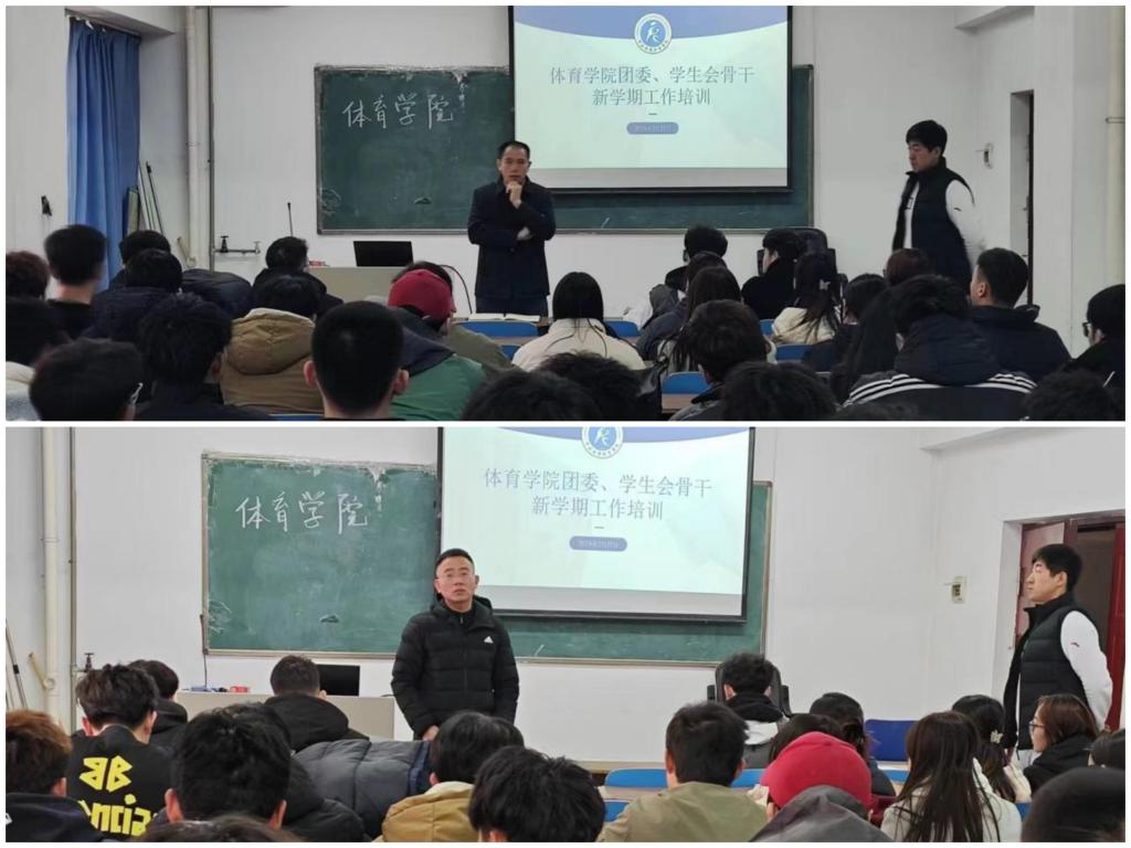2月27日下午,体育学院于院楼一层教室召开了团委学生会新学期工作培训会议。体育学院党委副书记贾鹏及全体辅导员老师参会并开展培训,院团委学生会副部长及以上成员参会。培训中,贾书记首先对团委学生会上学期的工作给予了充分肯定。随后,他重点针对本学期在大三学生干部骨干外出实习的情况下,如何高质量高效率完成工作进行了部署,并对全体学生干部提出要求,即制定工作计划,把握重要时间节点,发挥自身优势,创新工作方法,为学院的建设和发展贡献力量。随后,李士荣老师对团委学生会工作进行了具体部署,并要求学生干部继续严格要求自己,以身作则,发挥榜样引领作用。最后,李佳怿老师就各部门的具体工作进行了安排。