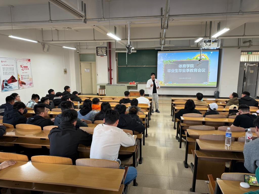 2024年3月14日下午,体育学院于15206H教室开展了2024届毕业生毕业季教育会议。院党委副书记贾鹏、学生科科长李士荣、辅导员李佳怿以及全体2024届毕业生参与会议。