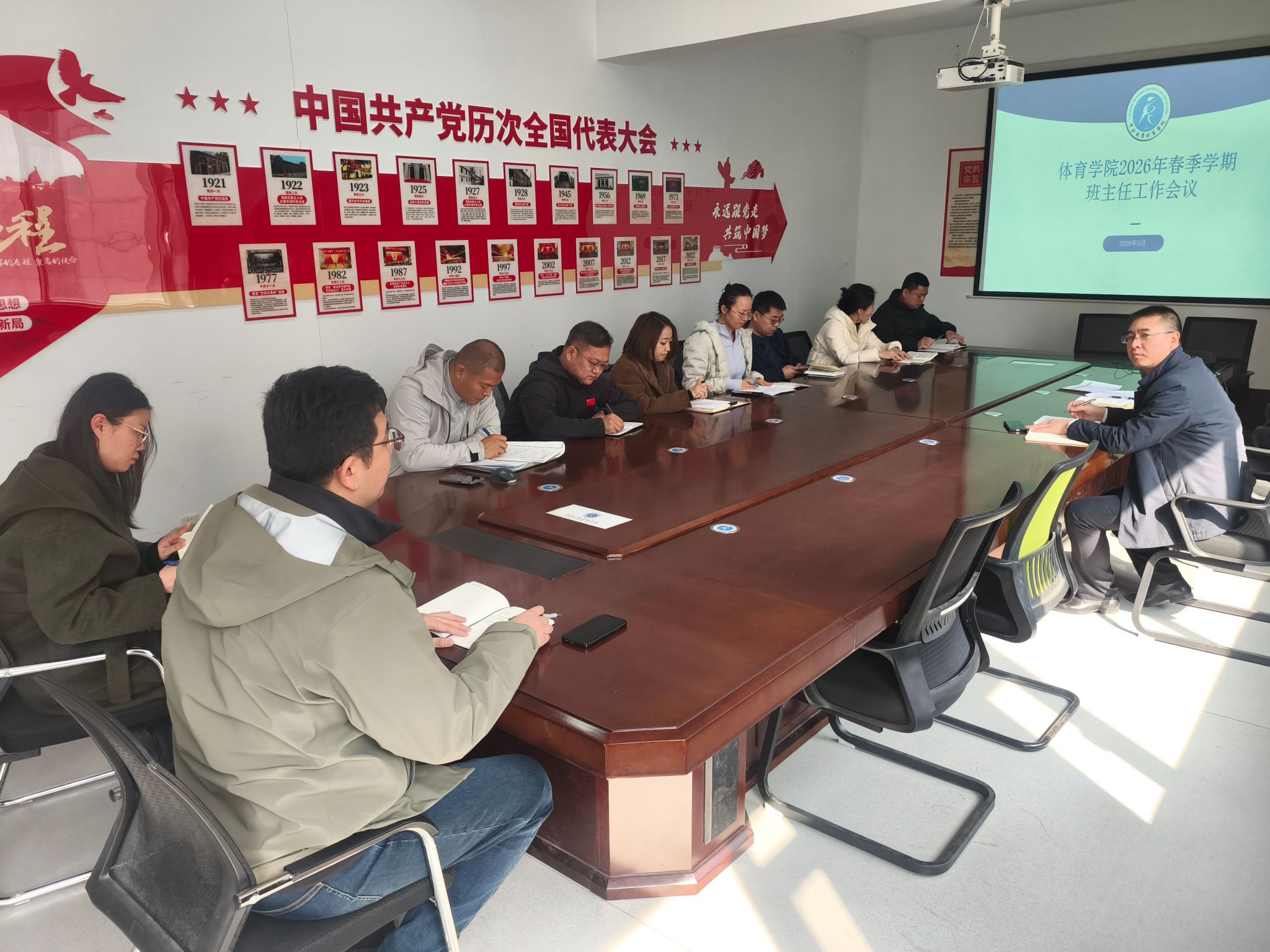 2026年3月10日,体育学院在院楼三层党员之家召开新学期班主任工作会议,院党委副书记李建国、学生工作负责人李佳怿及全体班主任参会,明确新学期班级管理工作重点,凝聚育人合力。