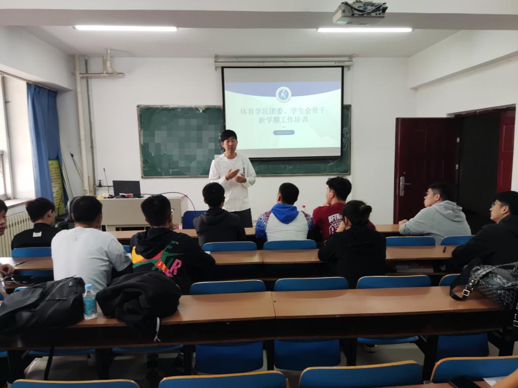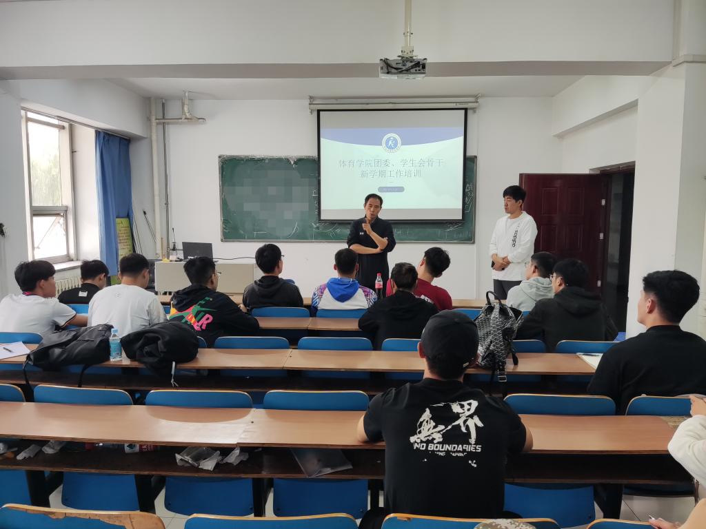 2023年9月20日中午, 体育学院在院楼一层教室召开团委、学生会骨干新学期培训会议。体育学院党委副书记贾鹏、辅导员李佳怿、全体新一届学生会骨干参会。