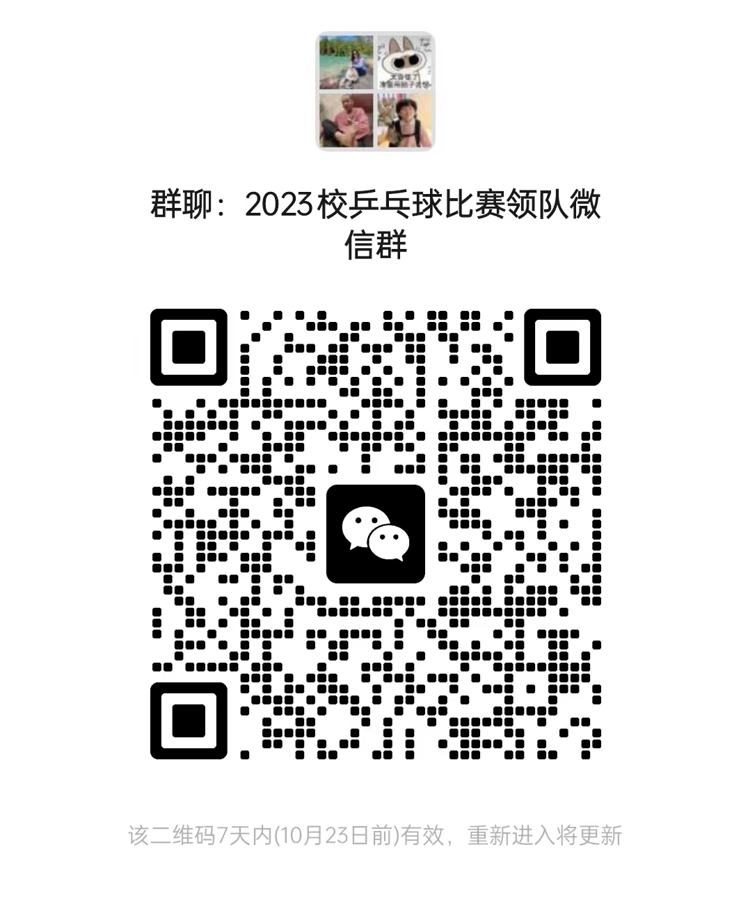 报名表(见附件)请于10月26日下午5:00交到乒乓球俱乐部(怡丁苑1号学生公寓地下室),并当场进行抽签分组。届时请各个学院的领队准时到会,电子报名表(见附件)(以“**学院乒乓球报名”为文件名)请于10月26日下午5:00发到“2023年校乒乓球比赛领队微信群”(扫下方二维码)。方便大家快捷沟通、快速解决问题。联系人:付老师:13994232276。
