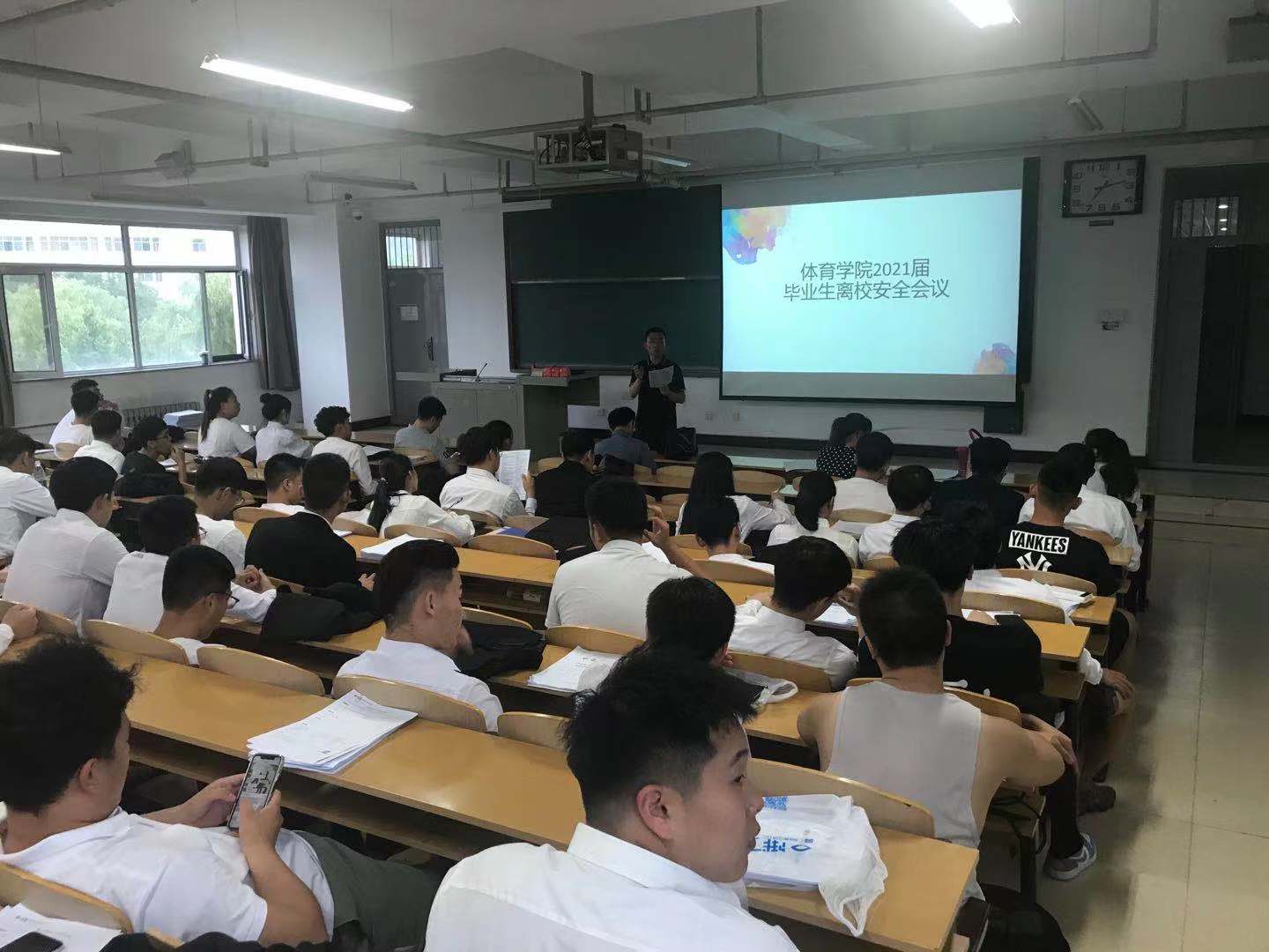 2021年6月15日,体育学院在15208召开了毕业生离校安全会议。本次会议由体育学院党委副书记贾鹏主讲,学生科长李士荣、团委书记王宇鹏以及全体2021届毕业生参加会议。