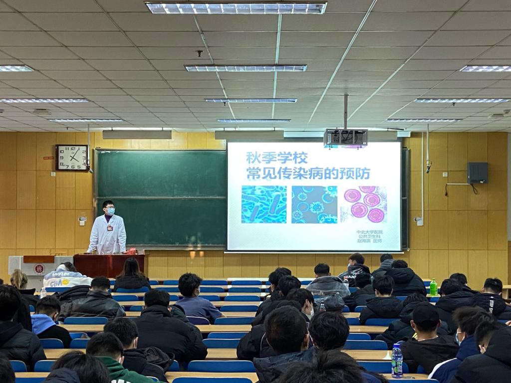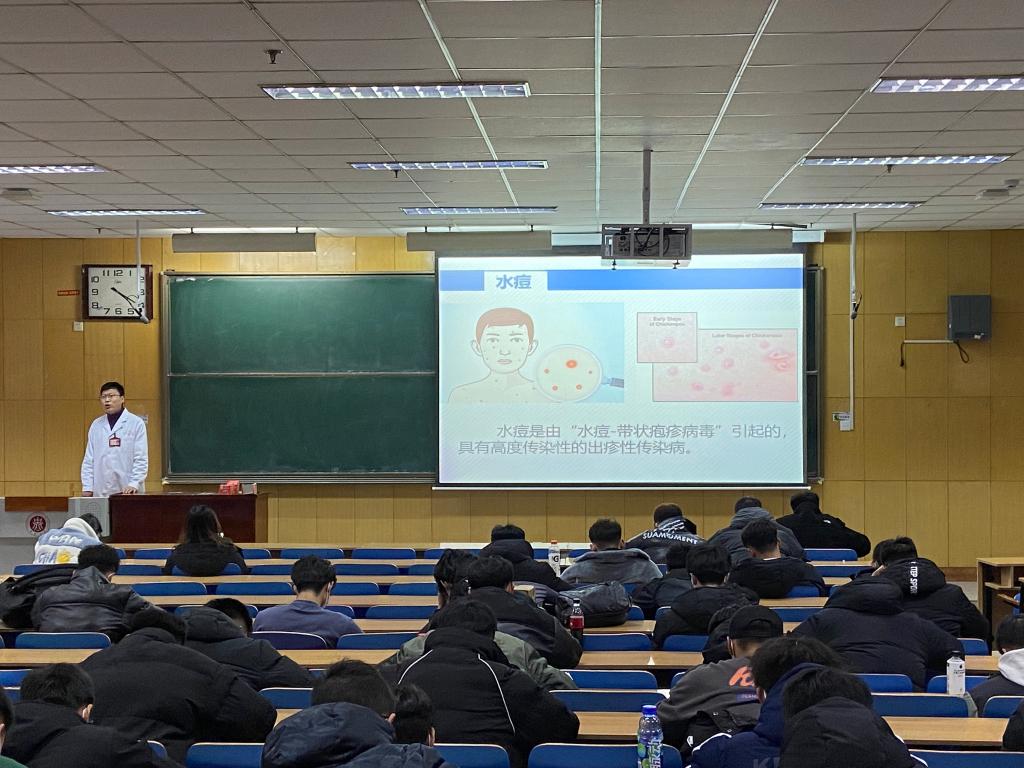 为防止水痘在学生群体中进行传播,增强体育学院学生传染病预防知识,2021年12月14日下午,体育学院在11108H教室开展健康教育讲座。本次讲座特邀校医院赵海滨医生主讲,各年级学生代表参加,内容主要涵盖结核病及水痘的发病、传播、常见症状、预防和治疗等方面。