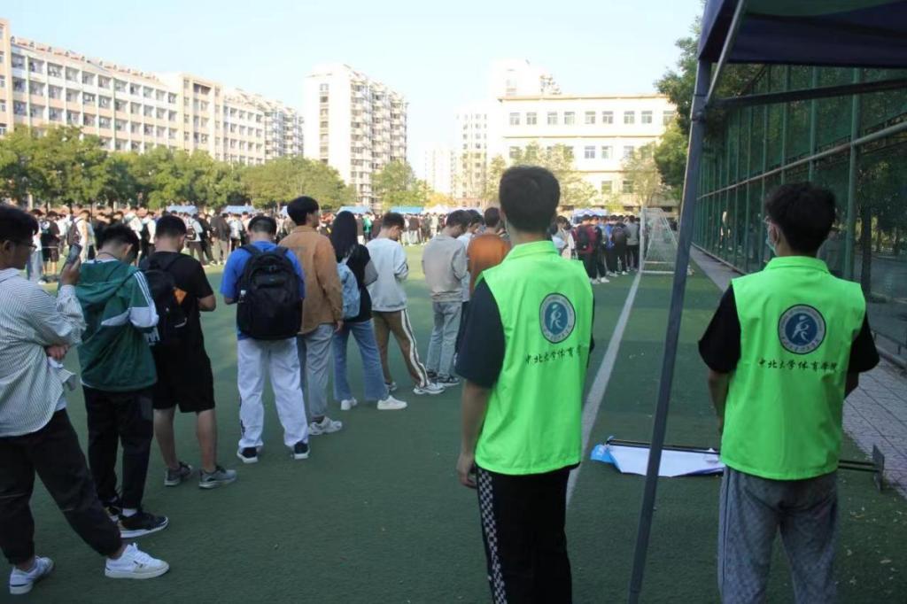 “请大家戴好口罩间隔一米,打开检疫码,有序登记”。9月29日,中北大学西区足球场上荧光绿的志愿者服装在队伍中显得格外亮眼。他们是来自体育学院的志愿者,积极保障和引导同学们有序的完成核酸检测。