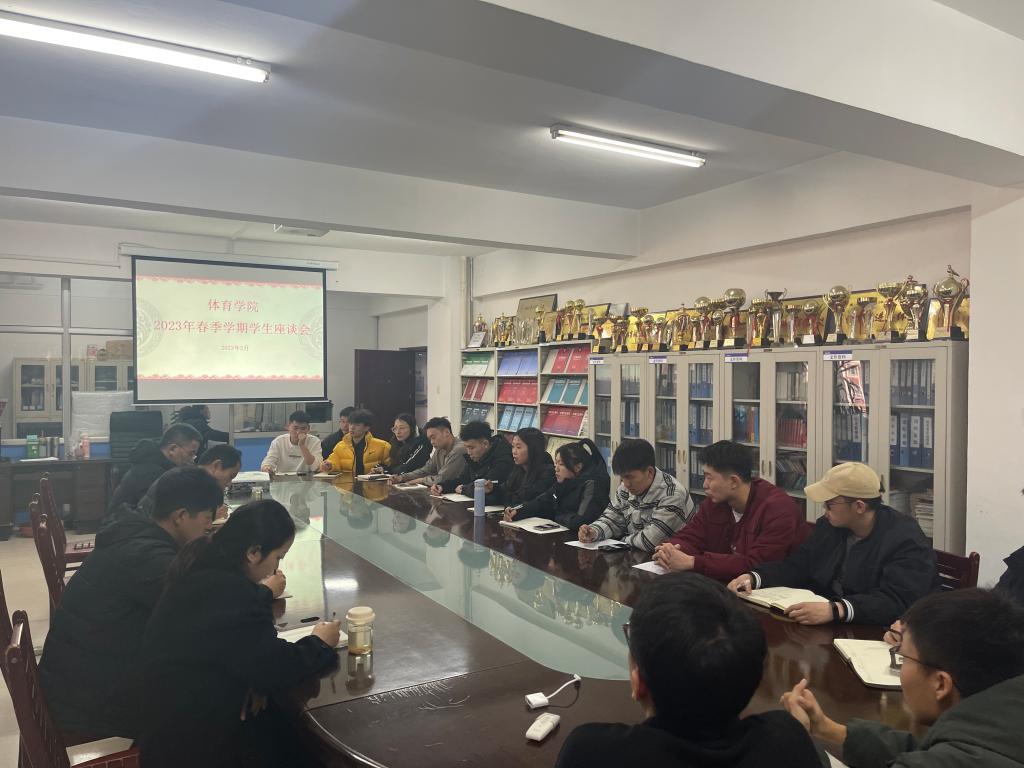 新学期伊始,为进一步了解学生的学习与生活状况,研究学生工作的新形势、新情况,倾听学生的心声,关心学生的健康成长,收集学生对学生教育管理的合理建议和创新思想,进一步增强学生管理工作的针对性和实效性,体育学院于2月24日下午在体育学院办公楼二层会议室召开了本学期学生座谈会。本次会议的参会学生为学院本科、硕士各班级学生代表,体育学院党委副书记贾鹏、学生科科长李士荣,以及辅导员班主任代表参会。