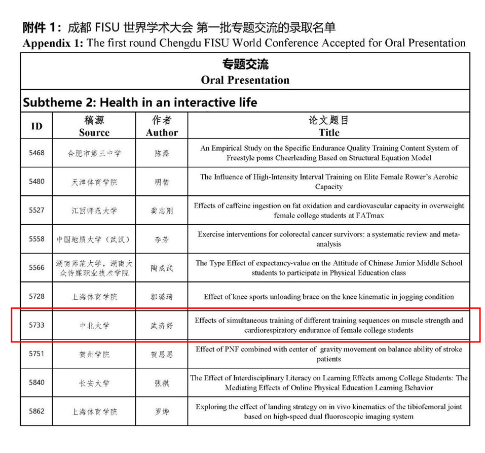 我校体育学院2021级研究生武济好同学(导师:吴剑教授)的论文《Effects of simultaneous training of different training sequences on muscle strength and cardiorespiratory endurance of female college students》被成都FISU世界学术大会收录为专题口头报告。