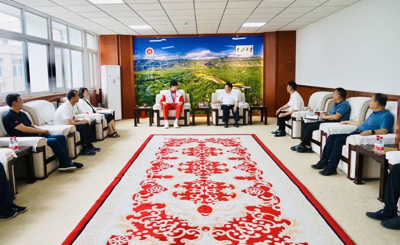 第31届世界大学生夏季运动会于7月28日至8月8日在成都举行。我校体育学院教师窦勇涛、陈丽莹以及运动训练专业2021级学生孟明宽实力入选本届大运会中国体育代表团,并在8月3日-4日进行的跆拳道项目比赛中斩获1金1铜的优异成绩。8月7日上午,我校为载誉归来的孟明宽同学、窦勇涛教练以及本次比赛的技术官员陈丽莹老师举行欢迎会。校党委书记沈兴全出席。学校办公室、学生工作部、教务部、校团委、体育学院等相关单位负责人及校跆拳道队负责老师窦勇涛、陈丽莹参加会议。