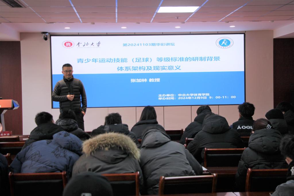 2024年12月9日上午,体育学院第20241103期华彩讲坛于11号楼715教室开讲,由学院副院长贾谊教授主持,特邀福建师范大学教授、硕士生导师张加林讲授,主题为:青少年运动技能(足球)等级标准的研制背景、体系架构及现实意义,全院师生聆听了本次讲座。