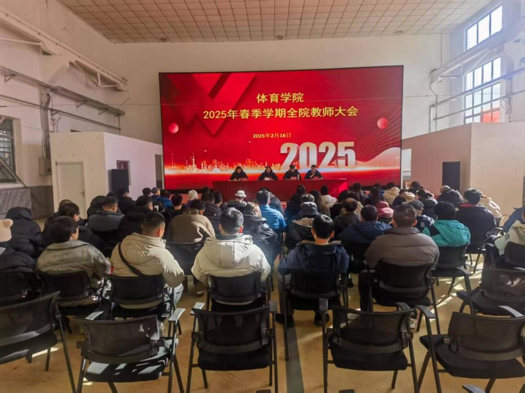 2025年2月16日上午,体育学院2025年春季学期全院教师大会在东区训练馆顺利举行。学院全体教师齐聚一堂,共同总结过去一年的工作成果,规划2025年的重点任务。会议由院党委副书记贾鹏主持。