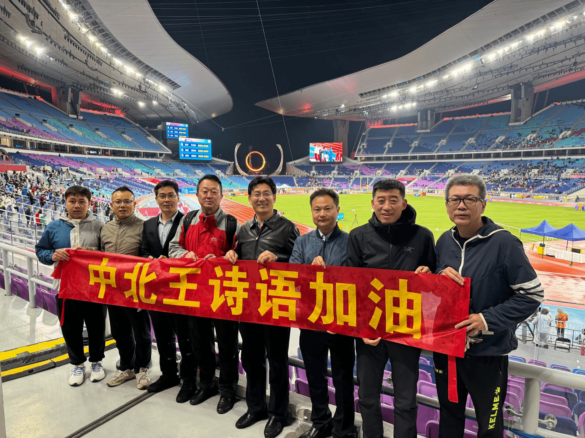 决赛现场,副校长来志斌亲临助威,与广东校友会的校友们一同组成了强大的后援团。他们挥舞着旗帜,齐声呐喊,为王诗语加油鼓劲,为中北呐喊助威,展现了中北人的团结一心与强大的凝聚力。