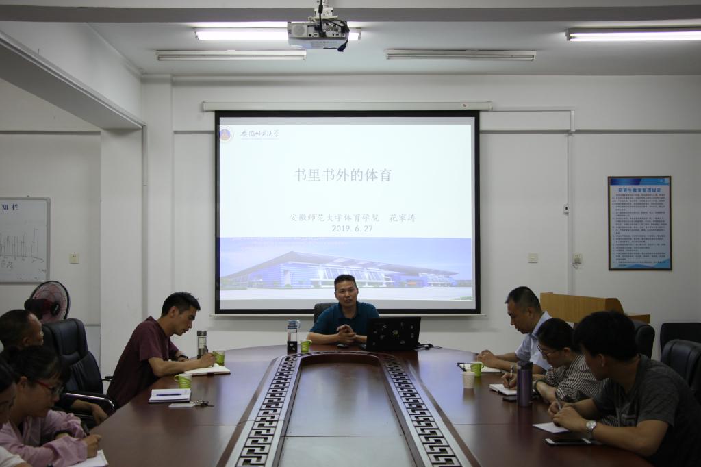 6月27日下午,安徽师范大学博士生导师花家涛教授受体育学院邀请来我校讲学,此次学术讲座的主题为《书里书外的体育》的讲座,讲座学科部副主任、民族传统体育学学术方向负责人宿继光主持,体育学院教师及研究生参加了此次会议。
