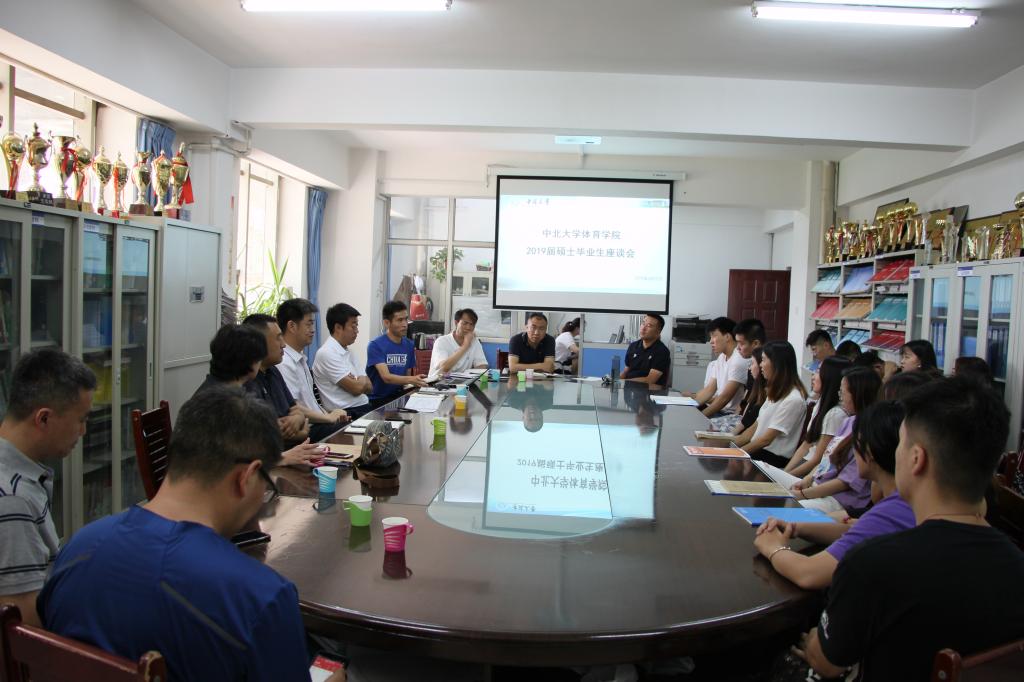 6月25日,体育学院2019届研究生毕业生座谈会在院楼二层资料室举行。体育学院党委书记王政宇、院长曹电康、副院长王晓刚、副院长吴剑、各学科部、教学科、学生科负责人以及各专业研究生毕业生代表参加了座谈。