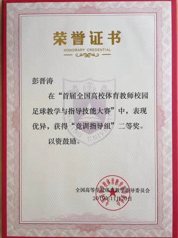 由全国高等学校体育教学指导委员会主办的“首届全国高校体育教师校园足球教学与指导技能大赛”,于11月18日-20日在南京大学仙林校区如期举行。本次大赛分为公体教学组和专业竞训组,来自全国28个省市自治区的200余位精英教师、教练员在课堂教学组织、高水平训练指导和运动实践能力等方面进行了全面的比武竞赛。我校体育学院彭晋涛、张扬两位教师,认真准备,稳定良好发挥,以优秀的训练指导能力和过硬的实践技术能力,分别获得专业竞训组二等奖和公体教学组三等奖的优异成绩,为我校争得了荣誉。