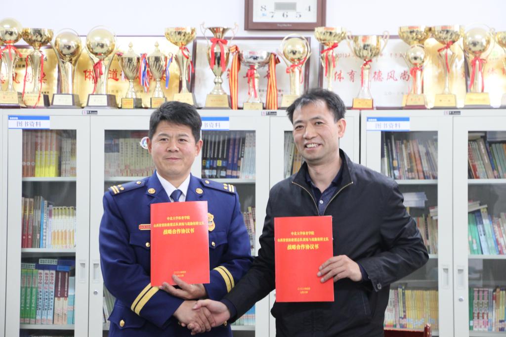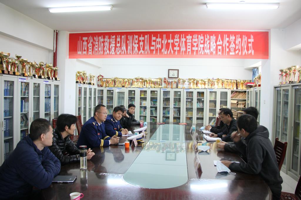 签约仪式上,双方就提升新兵体能训练科学化等问题和具体合作事宜进行了深入交流。曹院长表示,本次合作对我省消防救援战士的科学化体能训练意义重大,同时,也为体育学院师生施展专业技能提供了良好的平台,希望双方在今后的合作中,不断扩大合作空间。金政委代表训战保障支队向中北大学体育学院师生能够为战士体能训练提供理论和技术支持表示感谢,同时也非常期待在科学化训练指导下,战士训练效果的提升。随后,金政委和曹院长代表双方在合作协议书上签字。
