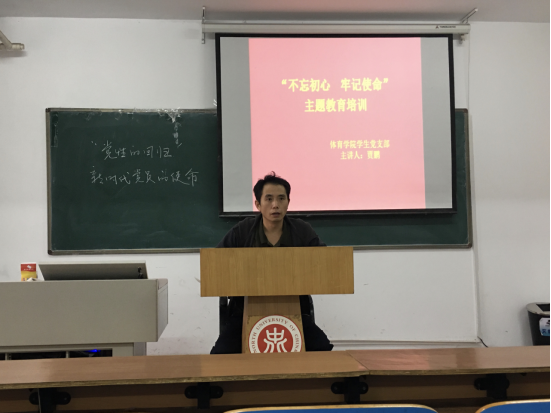 201910月14日下午体育学本科生党支部、研究生党支部开展“不忘初心、牢记使命”主题教育专题党课本次党课体育学院党委副书记贾鹏主讲。