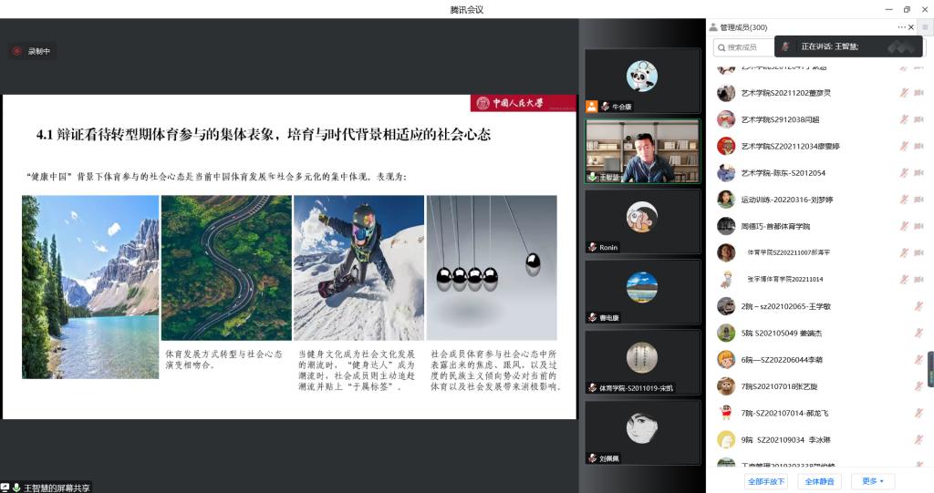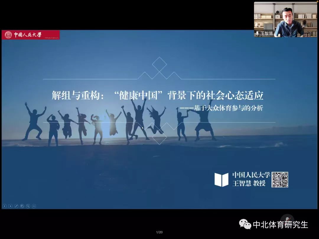 2022年10月19日下午,我校研究生第20221101期华彩讲坛于线上正式开讲,本期华彩讲坛特邀中国人民大学博士生导师王智慧教授主讲,主题为《解组与重构:健康中国背景下的社会心态适应——基于大众体育参与的分析》,由体育学院党委书记兼院长曹电康教授主持,全校三百余名师生聆听了本次讲座。
