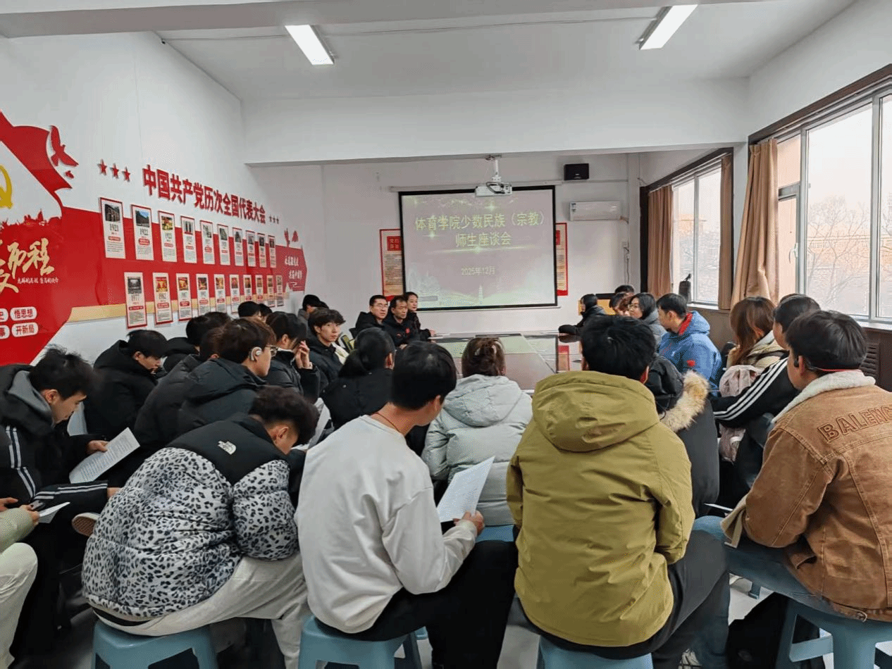 2025年12月18日下午4时,体育学院在 317 会议室召开少数民族及宗教师生座谈会。学院党委书记曹电康主持会议,党委副书记、副院长兼纪委书记李建国,党委委员、办公室主任李士荣,辅导员李佳怿出席,50 余名学生代表及1名少数民族教师代表参加座谈。