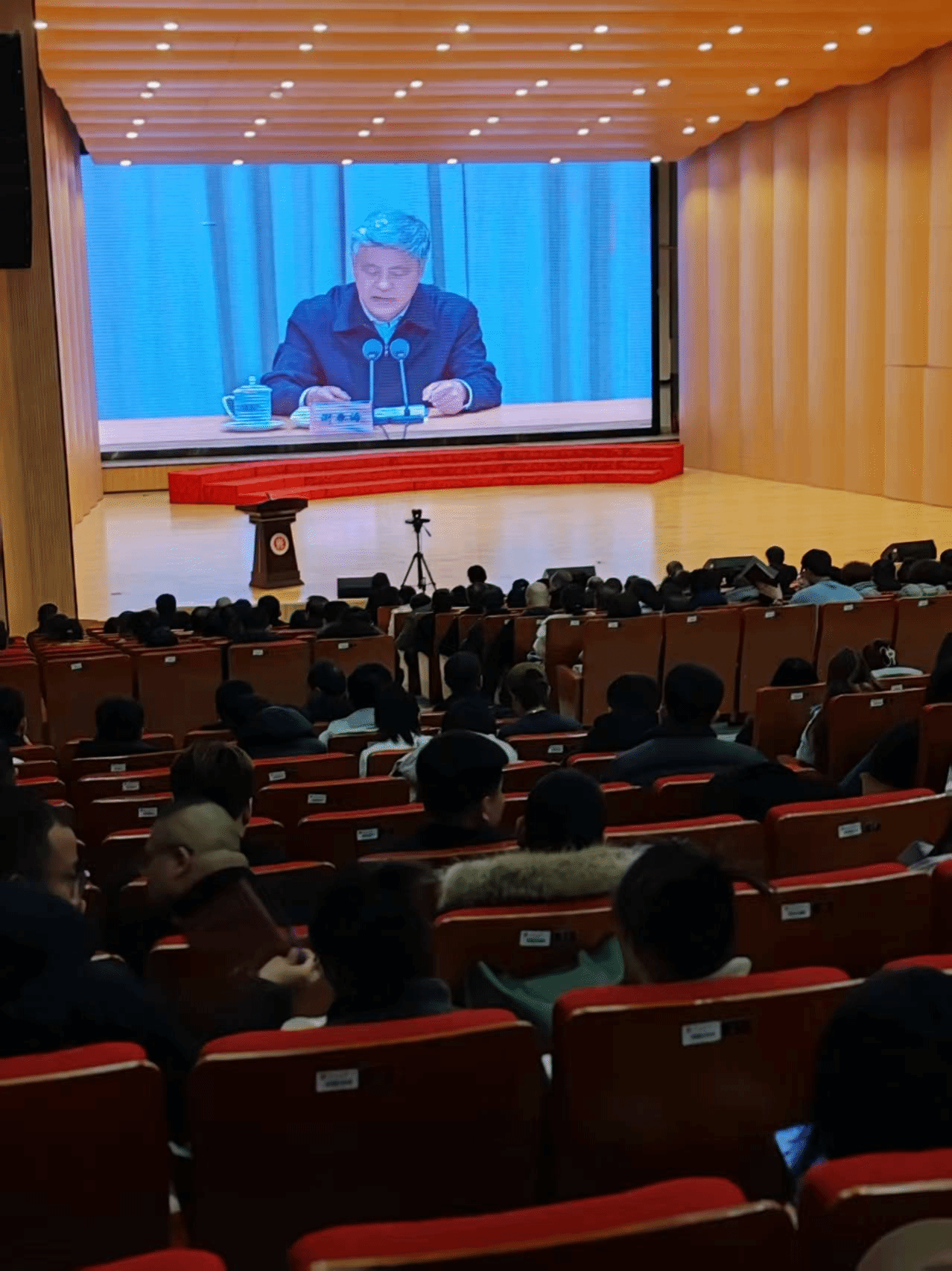 12月23日,2025年下半年党员基本培训第二次集中大课在科艺苑举行。本次大课采用“线上+线下”模式,全校5600余名党员分赴32个主分会场,共同学习中央党校(国家行政学院)谢春涛教授主讲的“中国共产党与中华民族伟大复兴”专题党课。校党委书记张晓永主持并讲话,体育学院组织103名党员在主会场科艺苑参训。