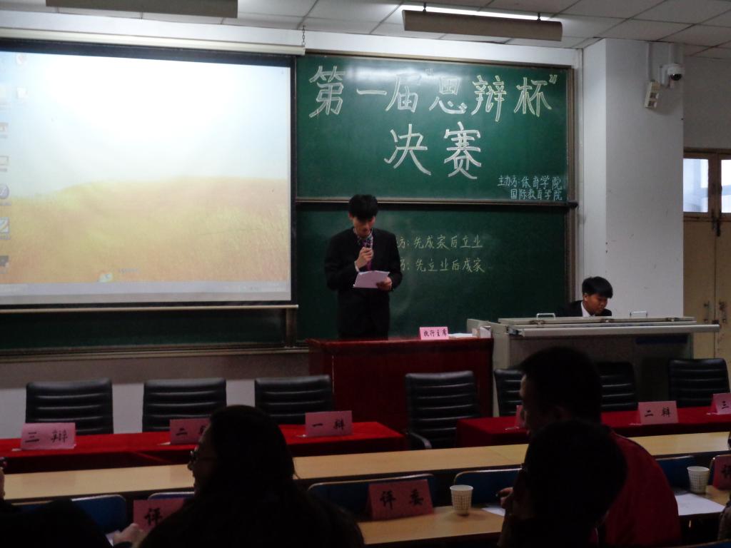 11月30 日,体育学院和国际教育学院学习部举办的第一届“思辩杯”决赛于11412教室隆重开始;到场的嘉宾有各学院学习部部长,及各班的拉拉队;经过主持人开场白后比赛正式开始;场上对战双方都就己方的观点做了充分准备,比赛过程中场上辩手旁征博引,妙语连珠,双方争锋激烈,互不相让,为大家奉献了一场有理有据不失礼节的精彩辩论。