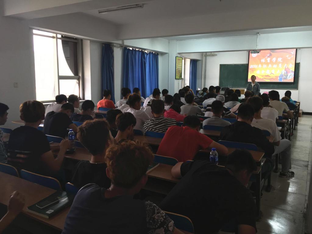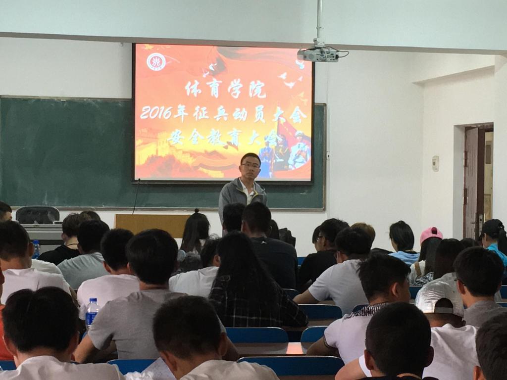 2016年5月11日下午体育学院学生科科长李士荣老师在学院一层多媒体教室主持召开了“体育学院2016年征兵动员暨安全教育大会”。