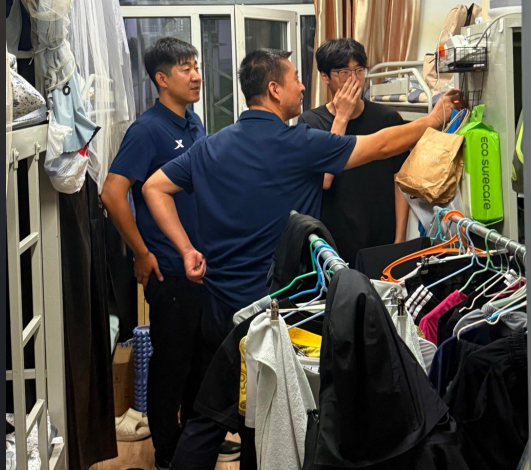 2025 年 8 月 31 日下午至夜间,体育学院开展新学期学生宿舍卫生安全大检查。体育学院党委副书记李建国带领全体辅导员共同参与检查。检查过程中,老师们重点查看了宿舍卫生状况,包括地面清洁、物品摆放等,对表现优秀的宿舍提出表扬,同时指出部分宿舍存在的问题,督促学生及时整改。在安全检查方面,细致排查了违规电器使用、电线私拉乱接等隐患,向学生强调安全用电的重要性。