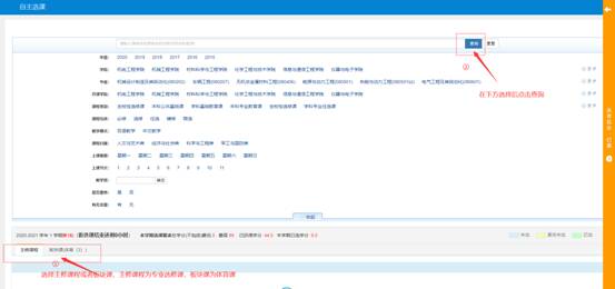 选课页面中选择主修课程或者板块课程:2020级体育(4)板块、2021级2021体育,点击查询按钮,查询后下方显示可选的教学班。