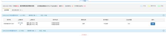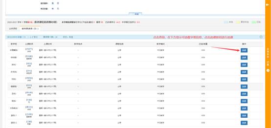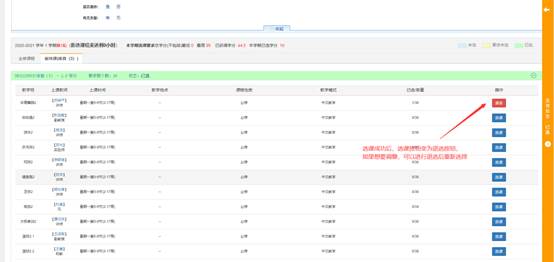 点击对应教学班后面的选课按钮进行选课,选课成功后选课按钮变为退选按钮,如需退选点击退选按钮。