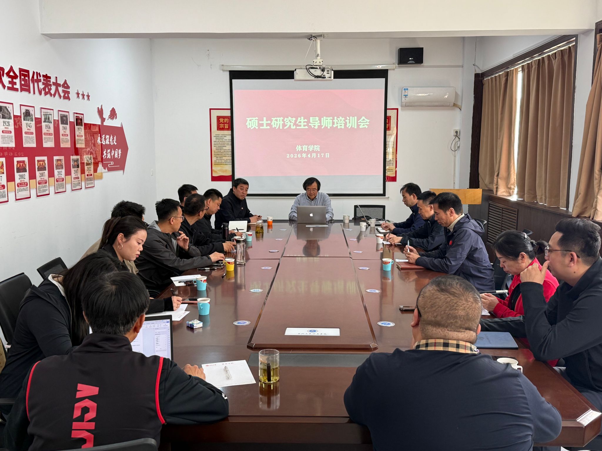 2026年4月17日上午,我院在院楼317室举行硕士研究生导师培训会,会议由吴剑院长主持。浙江大学王健教授应邀担任主讲,围绕“如何做一名合格的研究生导师”主题展开阐述。体育学院全体研究生导师及博士生出席本次培训会。