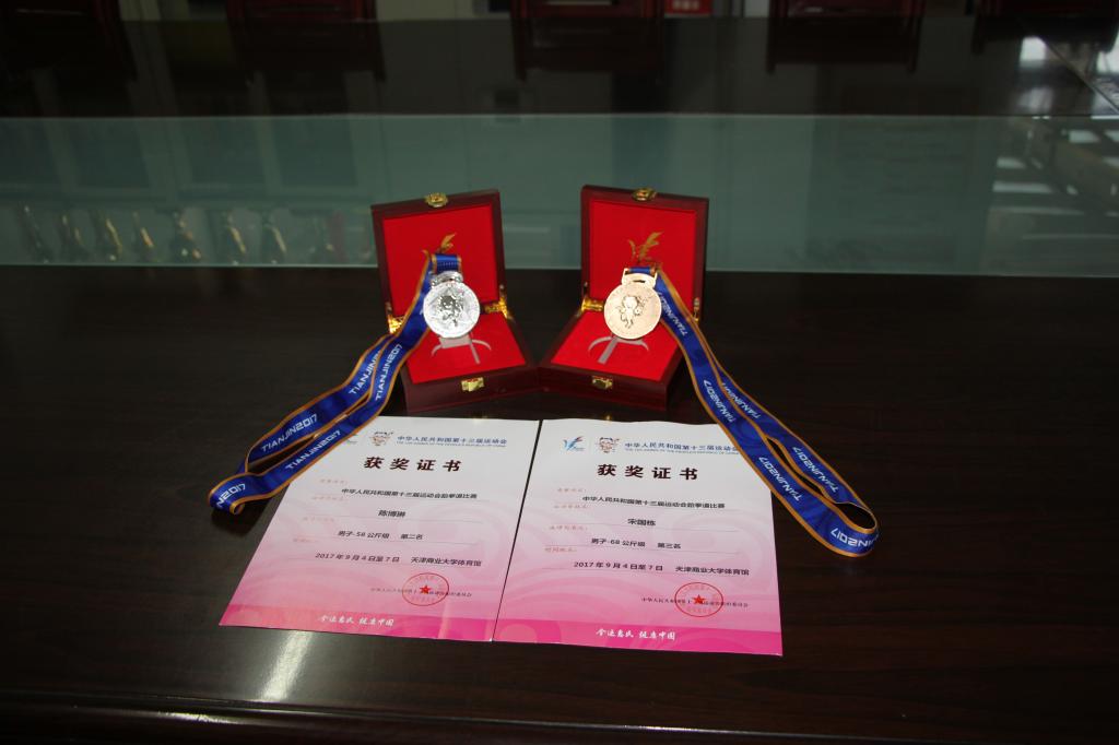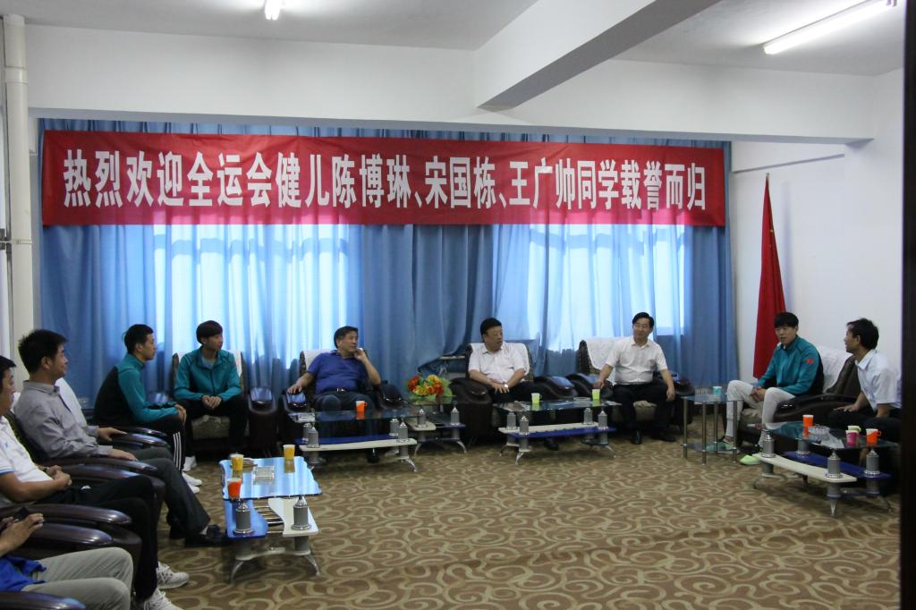 9月8日,校长刘有智,副校长曾建潮、白培康在体育学院会议室亲切会见刚刚结束第十三届全运会比赛载誉归来的我校跆拳道专业陈博琳、宋国栋、王广帅三位同学。经过多轮残酷较量,他们不负众望,最终陈博琳同学获得了-58公斤级银牌,宋国栋获得-68公斤级铜牌,王广帅获得-80公斤级第五名。填补了我校全国运动会无奖牌的历史,为学校争得了荣誉的同时也向全国人民展现了我校大学生的风釆。