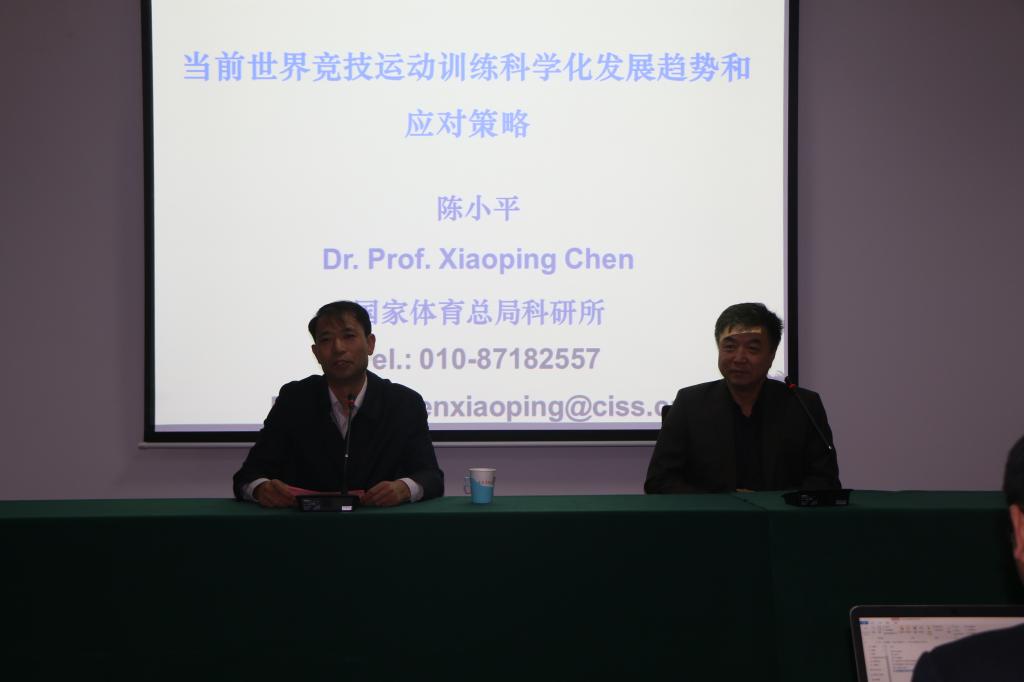 10月21日,国家体育总局体育科学研究所陈小平教授、王向东研究员应邀来我校讲学。两位专家在中北大学瑾瑜国际会议中心第一会议室分别就“当代运动训练发展趋势及其对我国奥运备战训练的启示”、“常用运动生物力学研究手段及应用”两个主题作了学术报告。学术报告由体育学院院长曹电康教授主持,体育学院全体师生参加了本次学术活动。